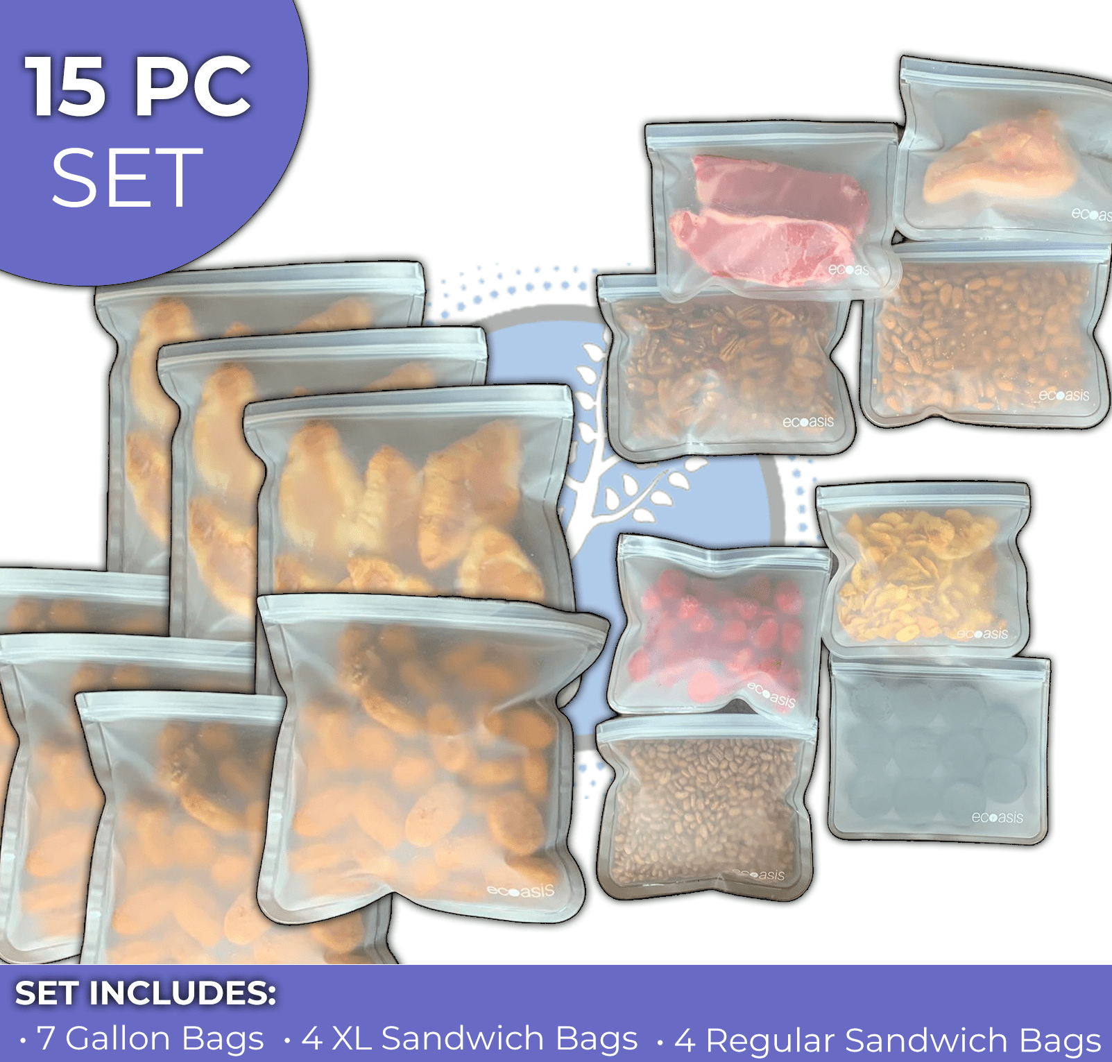 Our 10 PC sets come with 2 Gallon (28x27cm/11x10.6in), 4 Large (26x20cm/10.2x7.9in), and 4 Regular (22x18.5cm/8.66x7.28in) sized sandwich bags!